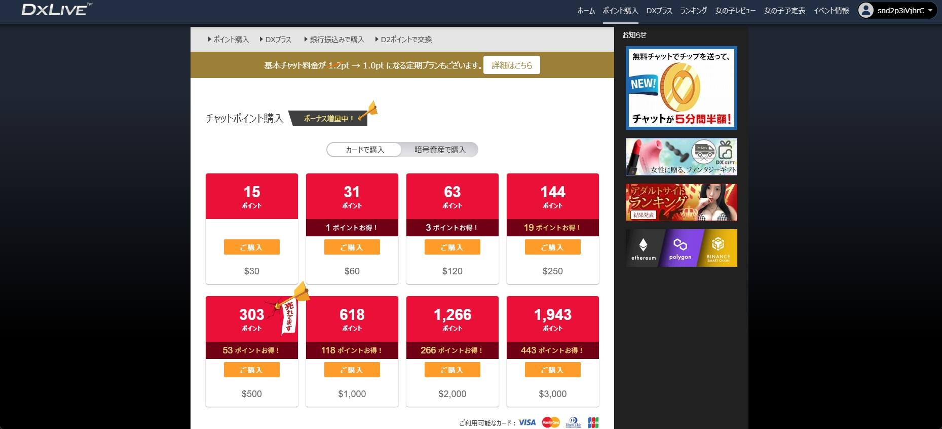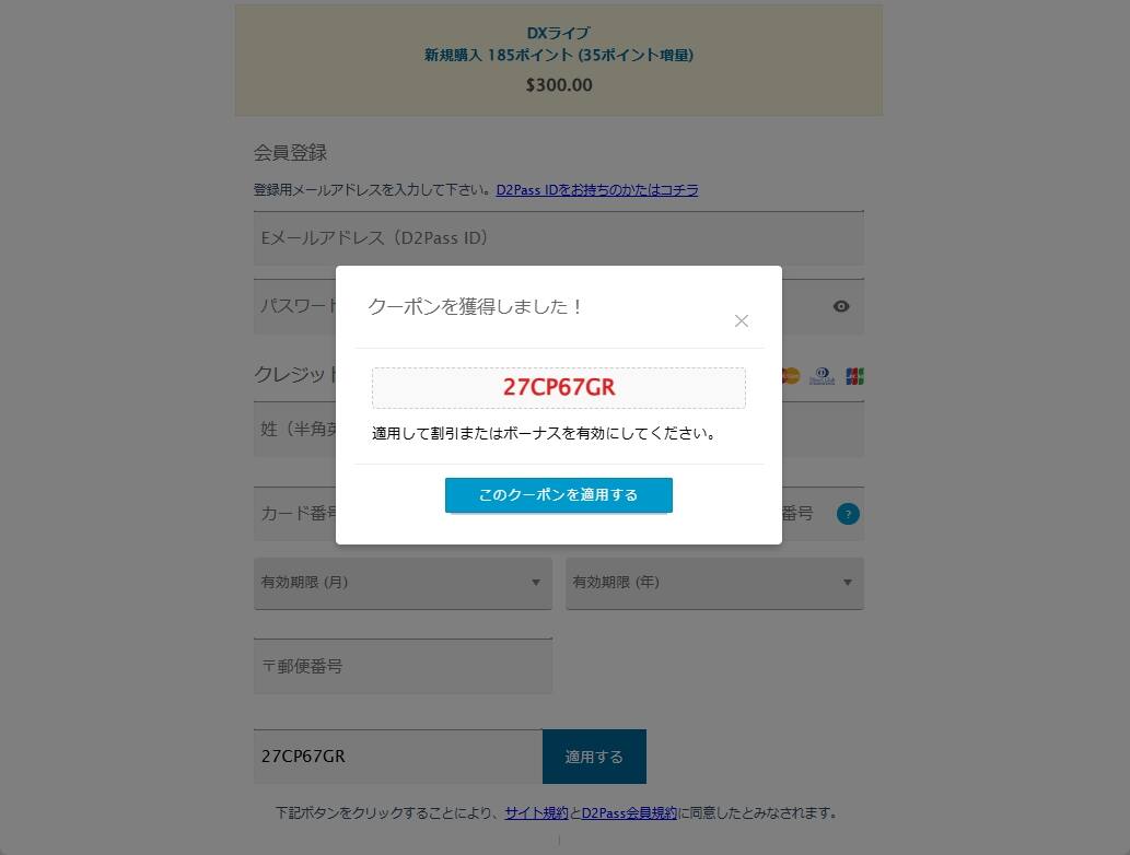 次に紹介するのは、当サイト一番人気の5%割引クーポンになります。こちらは2枚もDXLIVEからいただいています。無料のお試しプラン以外の全ての料金プランで使うことができます。ほとんどの方が少しでも割引額を大きくする為に、$300のポイント購入に使い、5%分安く購入しています。