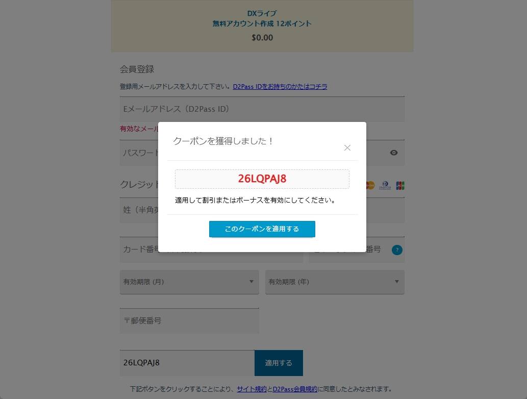 1アカウントに付き、一回しかご利用できません。また、他の紹介サイトでは説明していませんが、この割引クーポンはVプリカの支払いではご利用できません。クレジットカードのみです。また、カリビアンコムガール、感熟ライブで1度登録したクレジットカードでは、こちらのDXLIVEのキャンペーンはご利用できませんのでご注意くださいね。